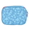 O fundo azul com padrão floral e silhuetas do Stitch adiciona um toque tropical, enquanto o zíper rosa com puxadores personalizados garante praticidade e charme.