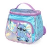 Na opção Stitch Azul e Lilás, o visual traz tons suaves e delicados, com o personagem em uma pose fofa na parte frontal, cercado por corações e detalhes brilhantes. O bolso frontal com paetês e as laterais estampadas completam o visual encantador.