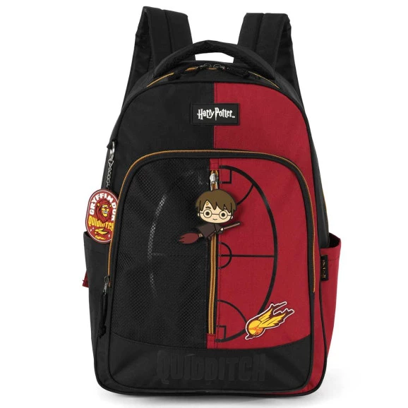A Mochila Harry Potter é perfeita para fãs do bruxinho mais famoso do mundo, disponível em duas opções de estampa: Hogwarts Express, com o icônico muro de tijolos da Plataforma 9¾ e detalhes dourados, e Quadribol, trazendo o campo de jogo e Harry voando em sua vassoura.